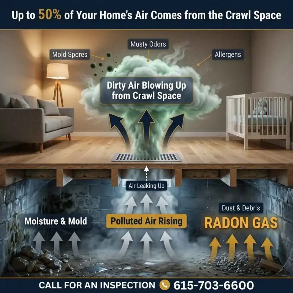 Most musty odors in Middle Tennessee homes come from one of three places: mold growing inside the duct system, moisture and mold in the crawl space, or contaminated air ducts circulating stale air through the house. A free inspection from a certified technician is the fastest way to find the actual source.
